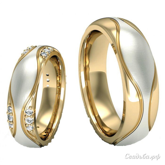 Эти великолепные парные обручальные кольца выполнены из комбинированного золота. Женское кольцо выглядит симметрично, а в середине узора имеет бриллиантовую вставку. Дизайн этих изысканных колец достаточно необычный и загадочный. Здесь, как будто, переплетаются два металла и сходятся они в виде восьмерки.