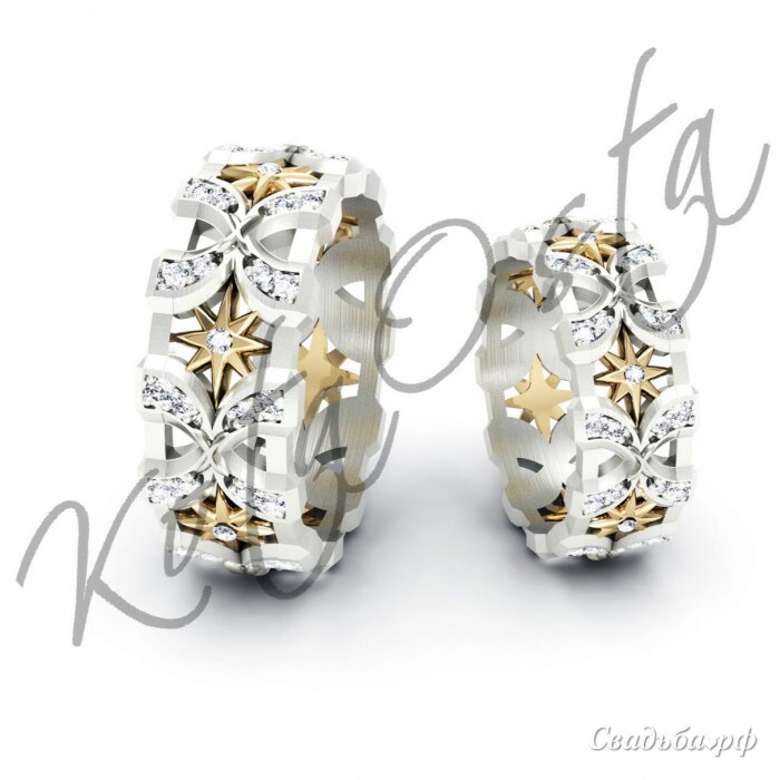 Сияние звезд из желтого золота и роскошь узоров из белого дарят этому кольцу восхитительный вид. Изделие сразу выделит его хозяина из толпы. Бриллианты вставлены в центр каждой звезды и по два во все лепестки рельефа из белого золота. Подобный сказочный шик редко встретишь среди ювелирных изделий. Кольца продаются в паре.