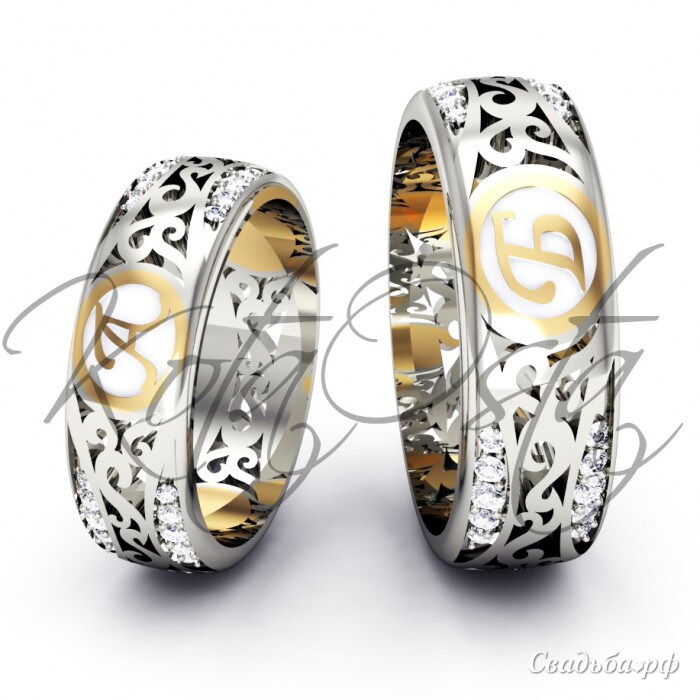 Парные обручальные кольца из нескольких видов драгоценных металлов никого не оставят равнодушным. Восхитительные узоры переплетаются со сверкающими бриллиантовыми вставками и с желтым золотом. Изюминка представленных колечек заключается в возможности выгравировать любую золотую букву и сделать изделие индивидуальным.