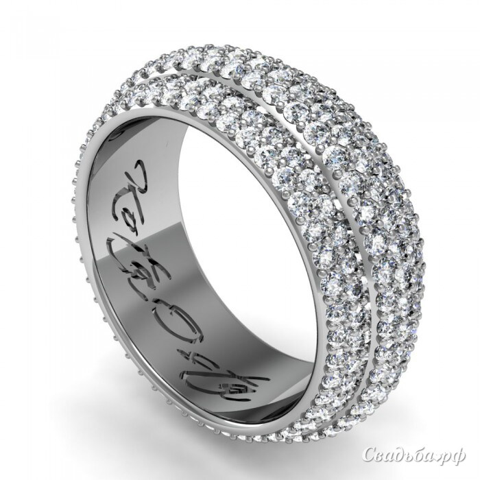 Необычное обручальное кольцо из белого золота, по всему своему диаметру усыпанное бриллиантами. Это кольцо отличается тем, что имеет выступ по центру изделия, который также усыпан драгоценными камнями. Кольцо смотрится благородно и элегантно. На внутренней части ювелирного изделия имеется гравировка.