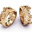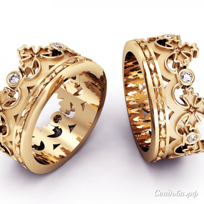 Оригинальные колечки от ведущих ювелиров России придутся по вкусу даже царским особам. Массивные ободки из жёлтого золота выполнены в форме королевских корон. Представленные изделия декорированы сверкающими бриллиантами и резным орнаментом. С такими обручальными кольцами вы всегда будете в центре всеобщего внимания.