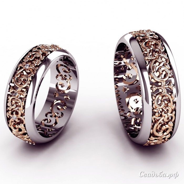 Оригинальные колечки выполнены из нескольких видов драгоценного металла. Массивные ободки декорированы затейливым орнаментом и сверкающими бриллиантами безупречной огранки. Такие обручальные кольца от лучших отечественных ювелиров не оставят равнодушными даже самых притязательных ценителей прекрасного.