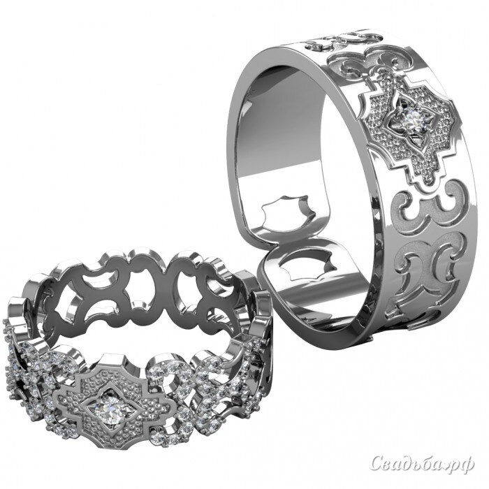 Парные обручальные кольца из белого золота выполнены отечественными ювелирами для самых стильных и требовательных молодожёнов. Обе модели могут похвастаться затейливым орнаментом и высочайшим качеством исполнения. Мужское кольцо дополнено одним бриллиантом, а женское украшение буквально усыпано сверкающими камнями. Вас точно заметят!