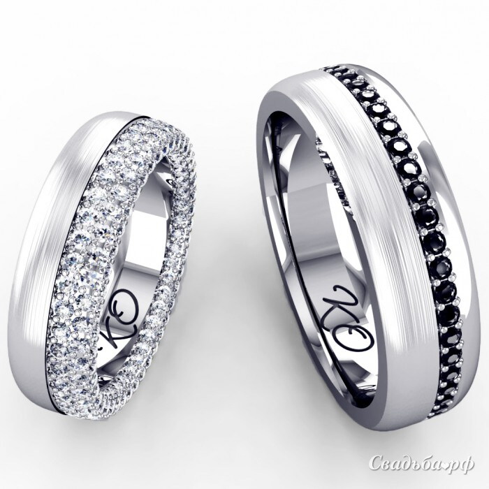 Эффектные обручальные кольца для Него и для Неё выполнены лучшими отечественными ювелирами из белого золота высочайшей пробы. Ободки классической формы украшены целой россыпью чистейших кристаллов: женская модель – прозрачными, мужская – чёрными. Колечки комфортно садятся на пальчик и отлично сочетаются с другими украшениями.