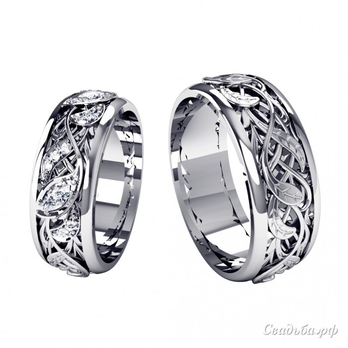 Роскошные обручальные кольца для Него и для Неё придутся по вкусу истинным ценителям стильных ювелирных украшений. Эти колечки выполнены отечественными мастерами из белого золота. Каждый ободок поражает тончайшим узором. Женская модель украшена чистейшими бриллиантами безупречной огранки. С такими колечками Вы всегда будете помнить о дне свадьбы.