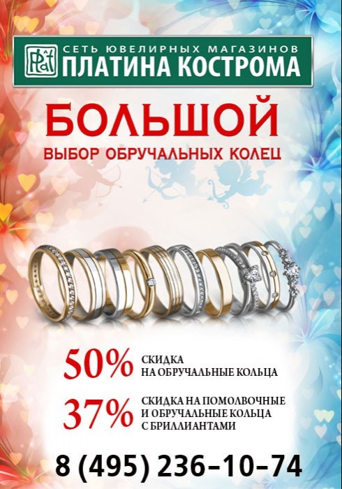 Здравствуйте!Мы с мужем покупали обручальные кольца в "Платина Кострома"! Получили каталог Свадьба в ЗАГСе, нашли там именно те модели колец, которые не могли найти в ювелирных магазинах. Зашла на сайт свадьба.рф, посмотрела весь ассортимент "Платина Косторома", и адреса магазинов. Поехали в один из магазинов в Золотом Вавилоне на Проспекте Мира. Там мы были приятно удивлены широким выбором ассортимента и приемлемыми ценами! А так же внимательностью консультантов! Оперативно подобрали размеры тех колец которые мы выбрали, предложили альтернативные варианты, мы получили консультацию по уходу за золотыми изделиями! В результате купили то что искали,и еще я подобрала серьги к свадебному платью! Советую всем, и не только молодоженам обратиться к ювелирным магазинам "Платина Кострома"!