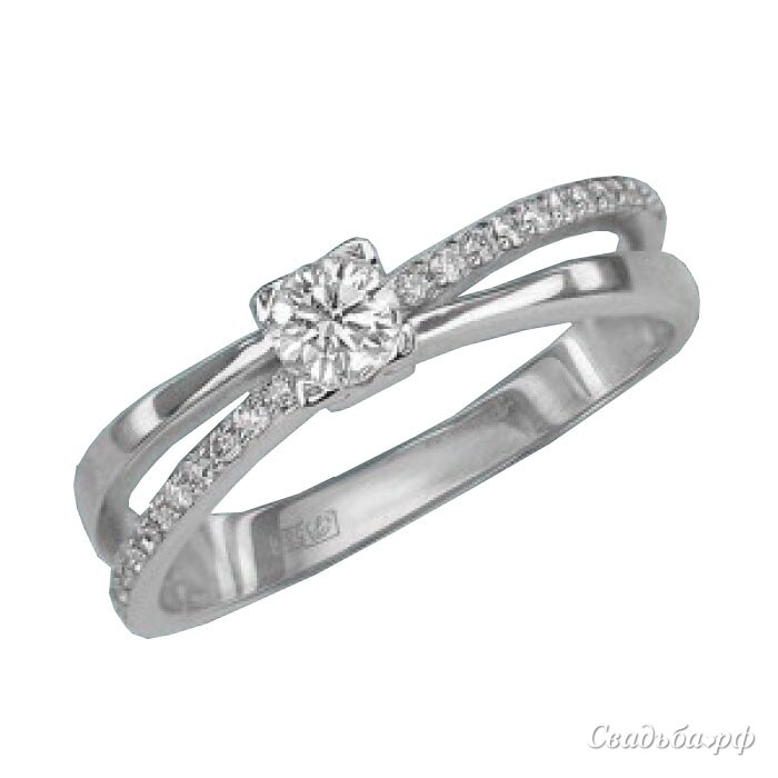 Изумительное обручальное кольцо из белого золота отличается оригинальными формами и продуманным до мелочей дизайном. Представленное ювелирное изделие декорировано одним крупным бриллиантом в центре и россыпью миниатюрных драгоценных камней по бокам. Широкий ободок раздваивается и придаёт модели неповторимый шарм.