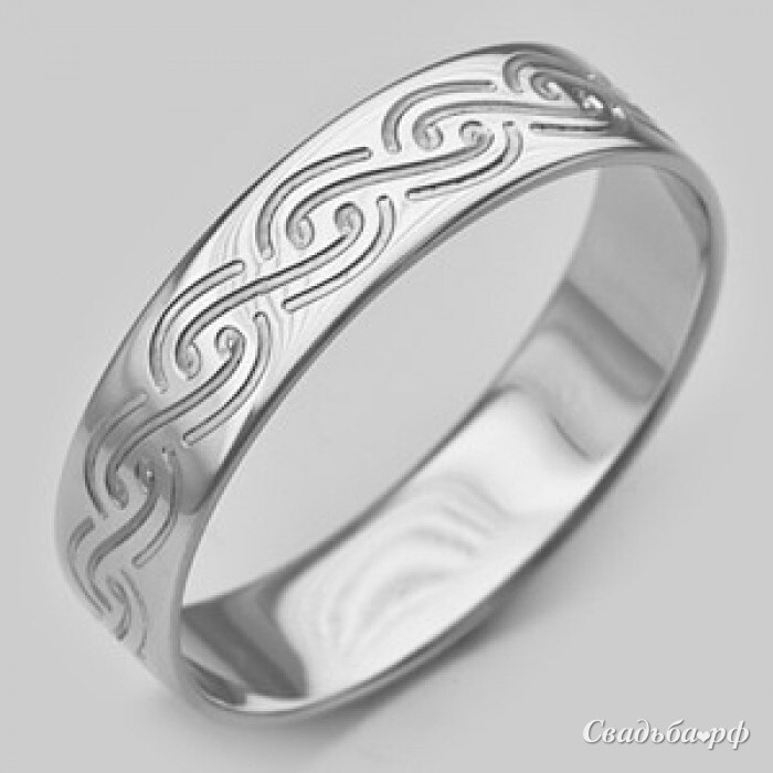 Элегантное обручальное кольцо из благородного белого золота поражает совершенством форм, высочайшим качеством и лаконичным дизайном. Изящный ободок представленного ювелирного изделия отечественного производства декорирован необычным орнаментом. Этот рисунок придаёт изделию лёгкость и неповторимое очарование.