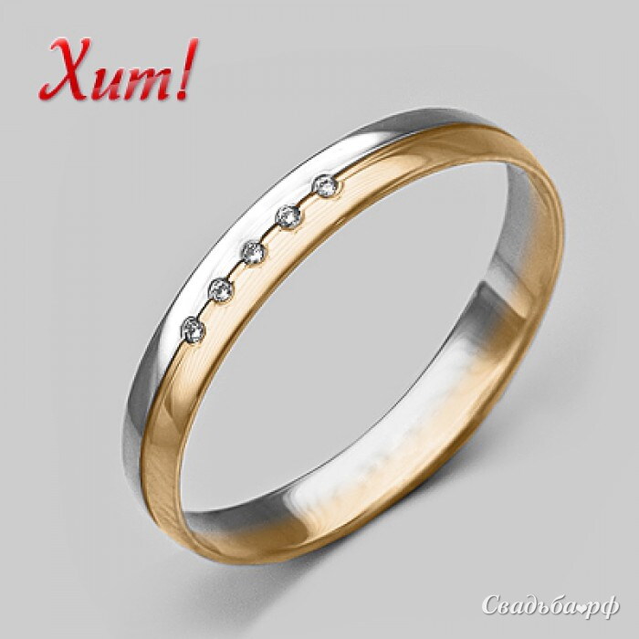 Элегантное обручальное кольцо выполнено лучшими отечественными ювелирами из жёлтого и белого золота. Граница драгоценных металлов обозначена выемкой. Посередине расположен ряд сверкающих бриллиантов безупречной огранки. Представленная модель сочетает в себе классические формы и современный дизайн. Кольцо удобно сидит на пальце.