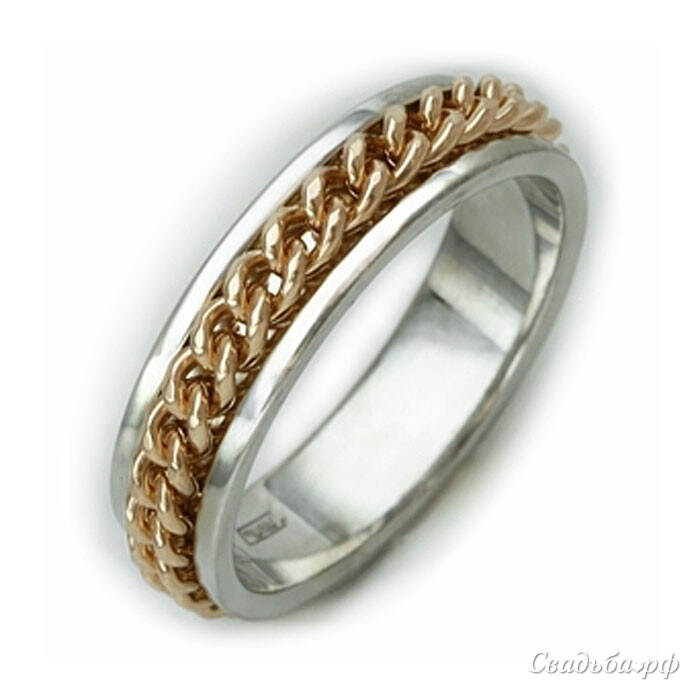 Роскошное обручальное кольцо из нескольких видов драгоценного металла станет эффектным украшением самого прекрасного пальчика в мире. Изюминкой представленного изделия является декоративная цепь из красного золота, элегантно расположившаяся на широком ободке. Оригинальное обручальное кольцо всегда будет вызывать восхищение окружающих.