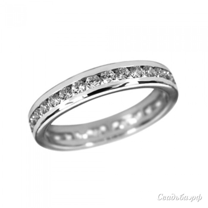 Обручальное кольцо выполнено из белого золота, украшено по всему периметру бриллиантами. Камни волшебно играют на солнце, благодаря прохождению света сквозь изделие. Притягательное и манящее сияние кольца подойдет тем, кто не прочь похватать его красотой.