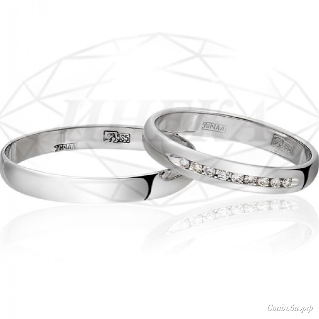 Парные обручальные кольца из белого золота 585 пробы, классические по форме, шириной 3мм. Женское с дорожкой из 9 Бриллиантов Кр 57 9х1,25-1,3 мм. В наличии.