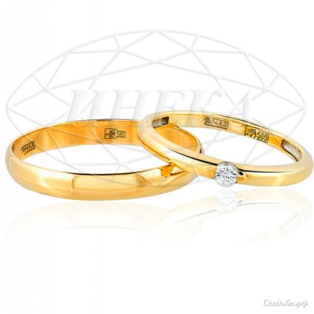 Парные обручальные кольца из желтого (лимонного) золота 585 пробы, классические, мужское ширина 3мм и женское ширина 2,5мм с 1 Бриллиантом. В наличии.