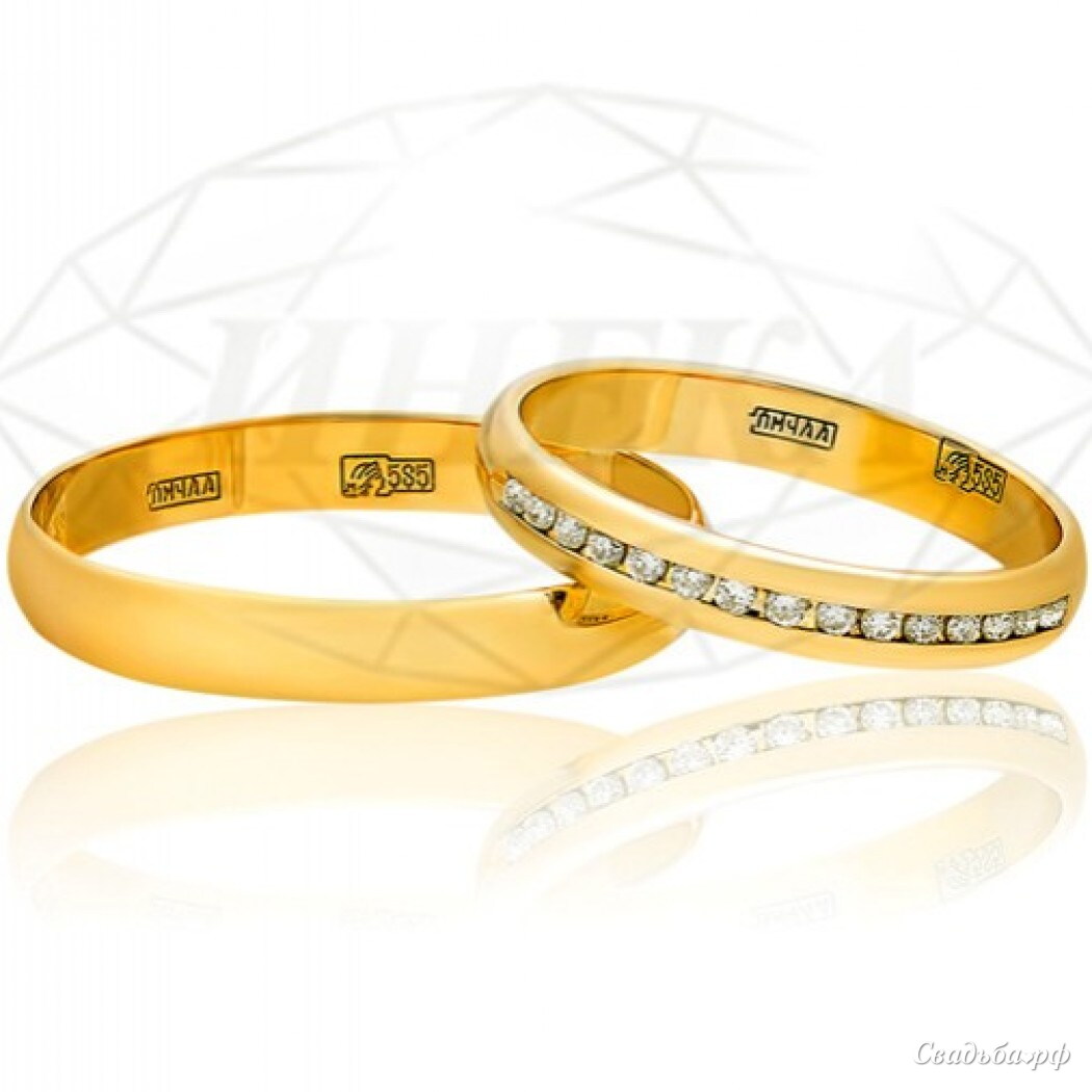 Парные обручальные кольца из желтого золота 585 пробы, классические, ширина 3мм. Женское с дорожкой из 15 Бриллиантов Кр 57 15х1,25-1,3 мм. В наличии.