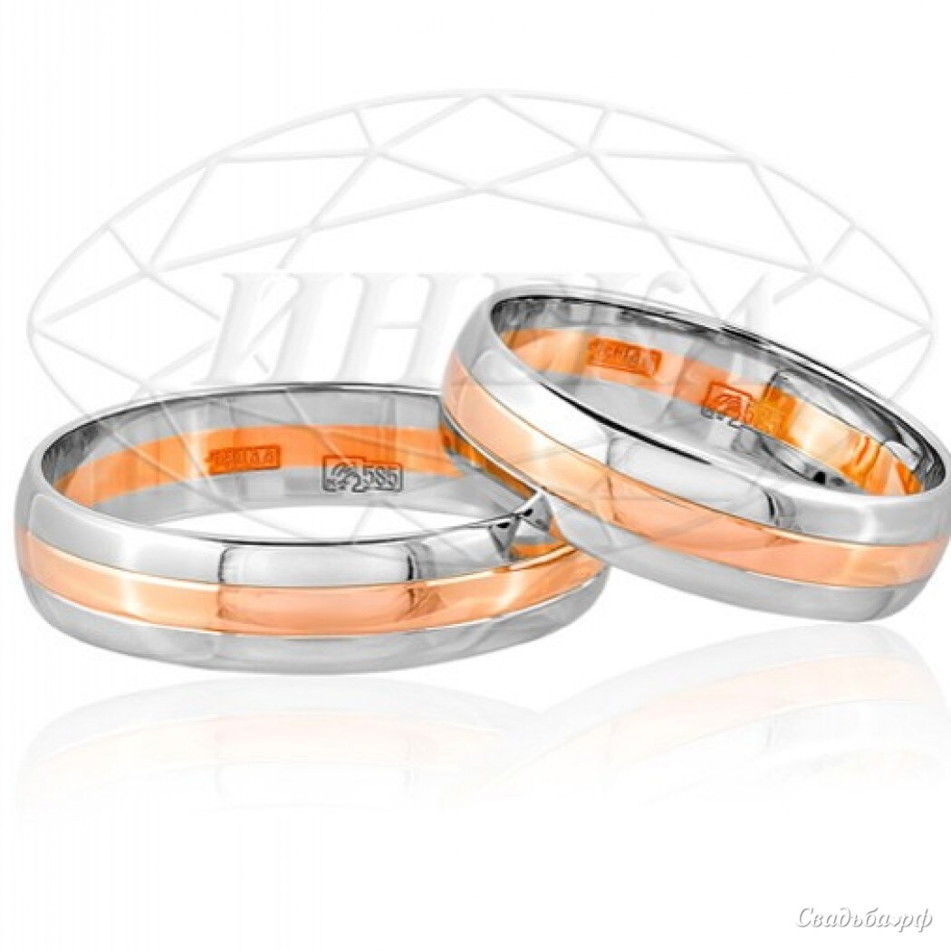 Комплект обручальных колец двусплавных - синтеринг (комбинированное из белого и по-середине красного золота), 585 пробы, глянцевое, классическое выпуклое по форме, шириной 5 мм. На стыке цветов борозда с алмазной огранкой придающая блеск. Возможно цвета золота изменить (желтое с белым золотом и т.д.). В наличии.
