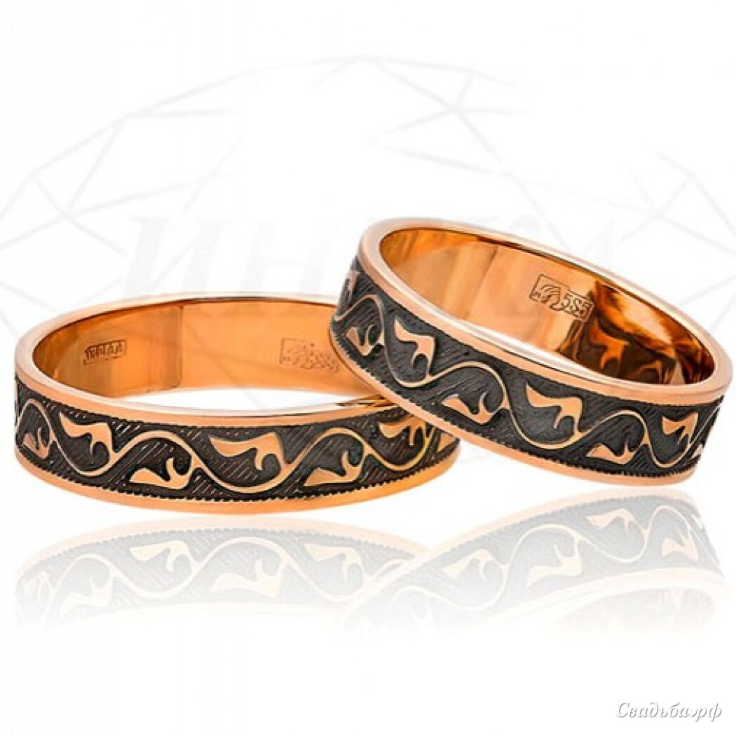 Комплект обручальных колец с чернением коллекции ZARA, плоское, шириной 5мм, в красном золоте 585 пробы с оригинальным рисунком. Чернение производится в углублённых частях изделий, что позволяет обручальным кольцам не терять при носке первоначальный вид, т.е. чернение не стирается. Можно по краю кольца инкрустировать дорожкой из 15 или 44 бриллиантов.