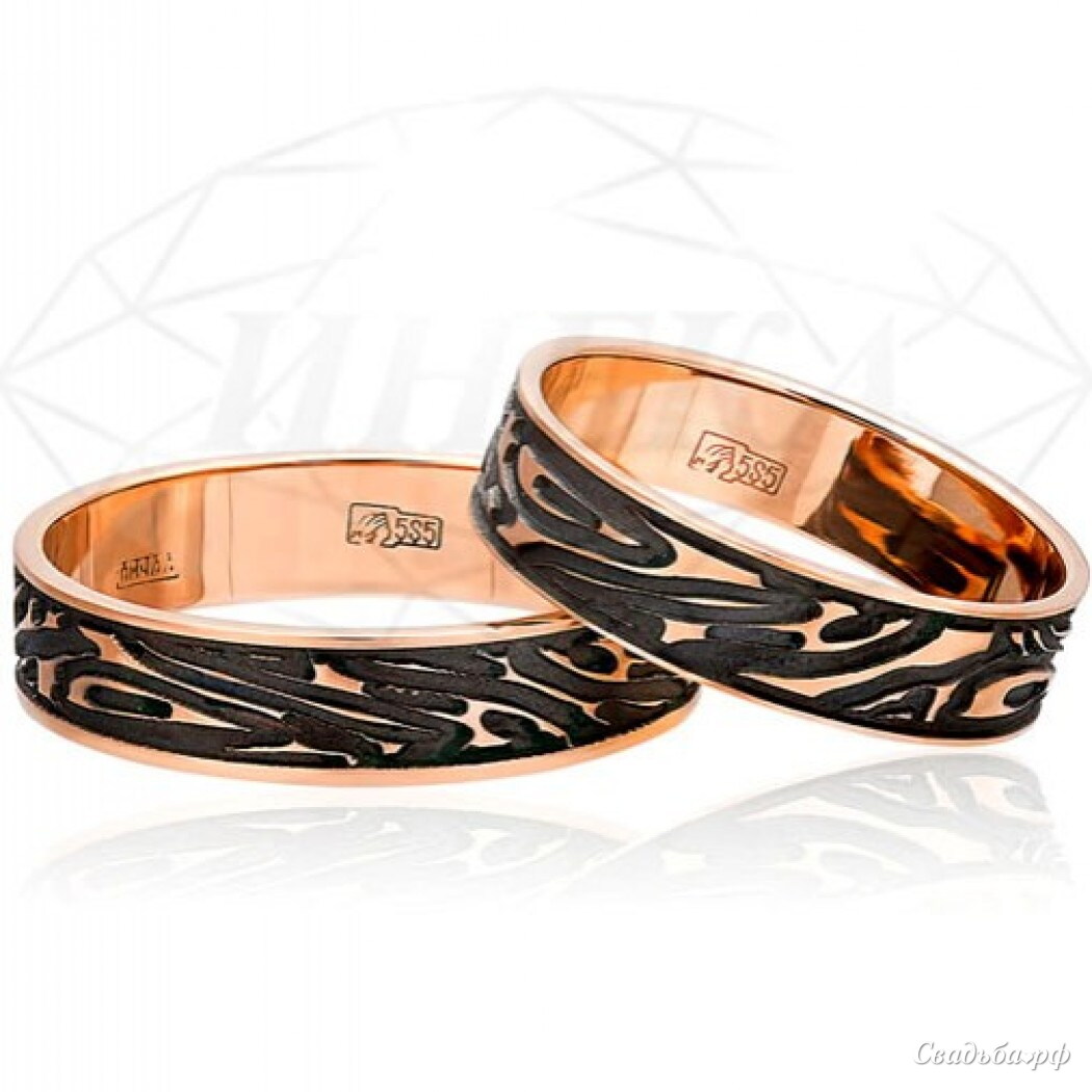 Комплект обручальных колец с чернением коллекции ZARA, плоское шириной 5мм, в красном золоте 585 пробы с оригинальным рисунком. Чернение производится в углублённых частях изделий, что позволяет обручальным кольцам не терять при носке первоначальный вид, т.е. чернение не стирается. Можно по краю кольца инкрустировать дорожкой из 15 или 44 бриллиантов.