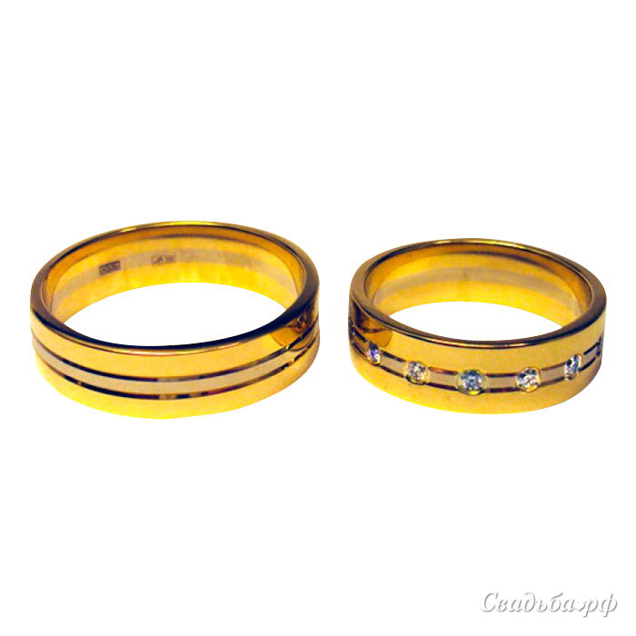 Двусплавные обручальные кольца из белого неродированного и жёлтого золота 585 пробы станут ярким украшением вашего неповторимого образа. Элегантный ободок изделия шириной 6мм ослепляет своим блеском. Средний вес модели составляет 7.52 г. Женское колечко по кругу декорировано 15 бриллиантами 0,3 ct 3/5. Средний вес 6.32 г.