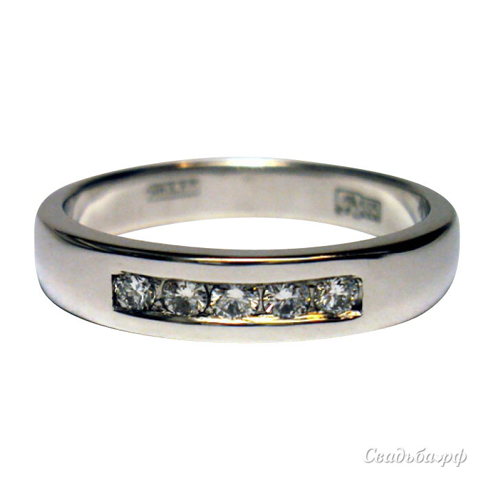 Элегантное обручальное кольцо из высококачественного белого золота 585 пробы создано для самых стильных натур. Колечко декорировано 5 сверкающими бриллиантами Кр 57 граней 0,17 ct 3/5. Средний вес модели 3.5 г. Это украшение представлено в размерном ряду с 16 по 18 (любой другой можно изготовить на заказ).