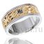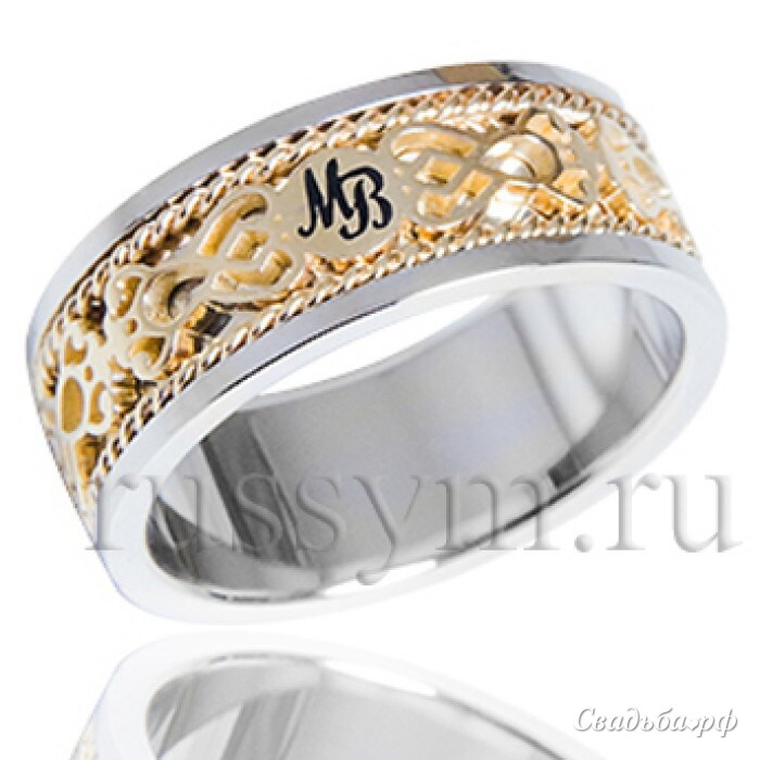 Обручальные кольца с инициалами молодых и оригинальным орнаментом выполнены из комбинации белого и желтого золота 585 пробы с бриллиантом 3мм. По краю кольца - филигрань. Так же изделие можно сделать из белого, красного и желтого золота 750 пробы. Цена указана за кольцо 16 размера. Вес 7,7грамм.