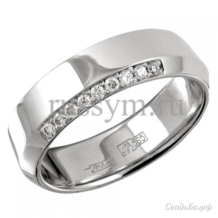 Массивное обручальное кольцо сделано из белого золота 585 пробы. Это эффектное украшение от лучших отечественных ювелиров может быть также выполнено из золота 750 пробы. Возможны цветовые вариации. Цвет на цену не влияет. Вес изделия составляет 5,29 грамма. Модель дополнена 9 бриллиантами с 57 круглыми гранями 0.09 карат, 3/4.