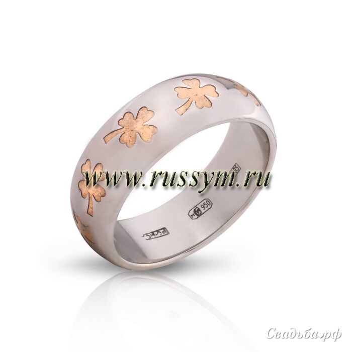 И на вопрос морозным зимним днем: Любовь, удача, вы со мною навсегда? В ответ услышишь Да! Впервые – обручальное кольцо из платины 950 пробы, инкрустированное золотом 585 пробы. Широкий ободок украшен солнечными листочками клевера с четырьмя листиками – символом удачи и вечного благополучия. Роскошное колечко для самого любимого человека!