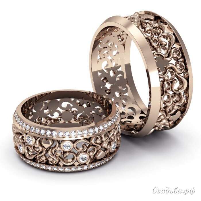 Эти шикарные обручальные кольца могут быть выполнены из металла на ваш выбор. Вставки могут быть как бриллианты, так и любые другие камни. Колечки с широкими резными ободками поражают тонкостью работы и высочайшим качеством исполнения. Для получения более подробной информации звоните в наш ювелирный салон.