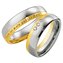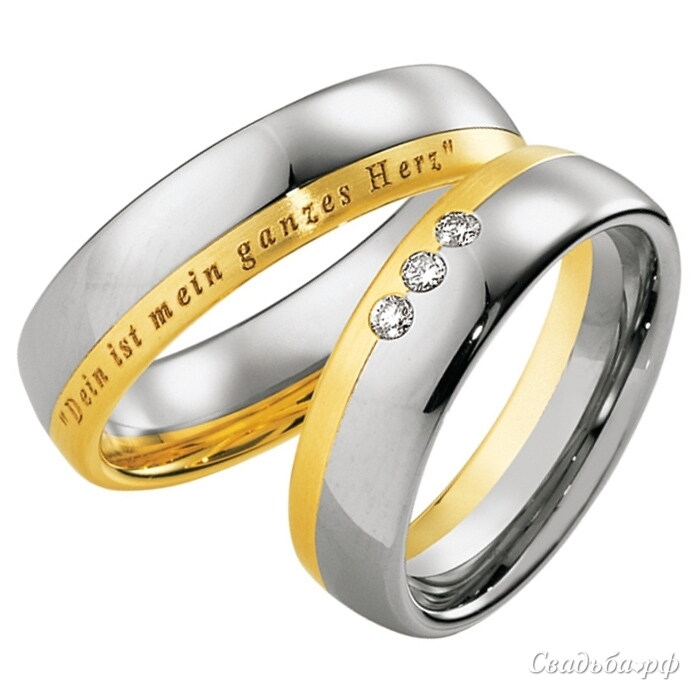 Парные обручальные кольца из белого и желтого золота, вариант для нее декорирован вставкой из бриллиантов, для него украшен надписью. Две не одинаковые по размеру линии из драгоценных металлов придают дизайну удивительную четкость, ясность и даже некоторую строгость, а блеск бриллиантов в «женской» модели — дарит ощущение праздника.