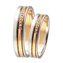 Восхитительные обручальные кольца из коллекции Триумф, созданы мастерами из нескольких металлов: белого и желтого золота. Две полоски белого золота обрамляют внешний край украшения, а полоса желтого золота проходит по центру. Рельеф выполнен так, что металлы разделяются бороздками, причем центральная полоска выполнена под наклоном, что придает асимметрию и еще большую привлекательность кольцу. Ряд бриллиантов в желтой полосе, расположенных полукругом, сверкает немеркнущим блеском.