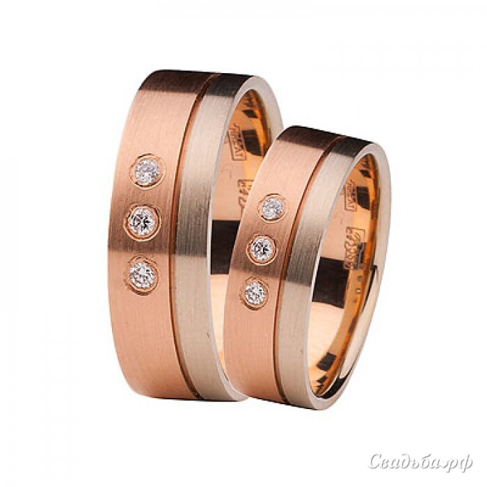 Необычные обручальные кольца из новейшей коллекции ювелирных изделий Триумф никого не оставят равнодушным. Оба колечка с широкими ободками выполнены из розового золота и декорированы тремя сверкающими бриллиантами. Такие украшения никогда не останутся без внимания. Цена изделий зависит от варианта исполнения.