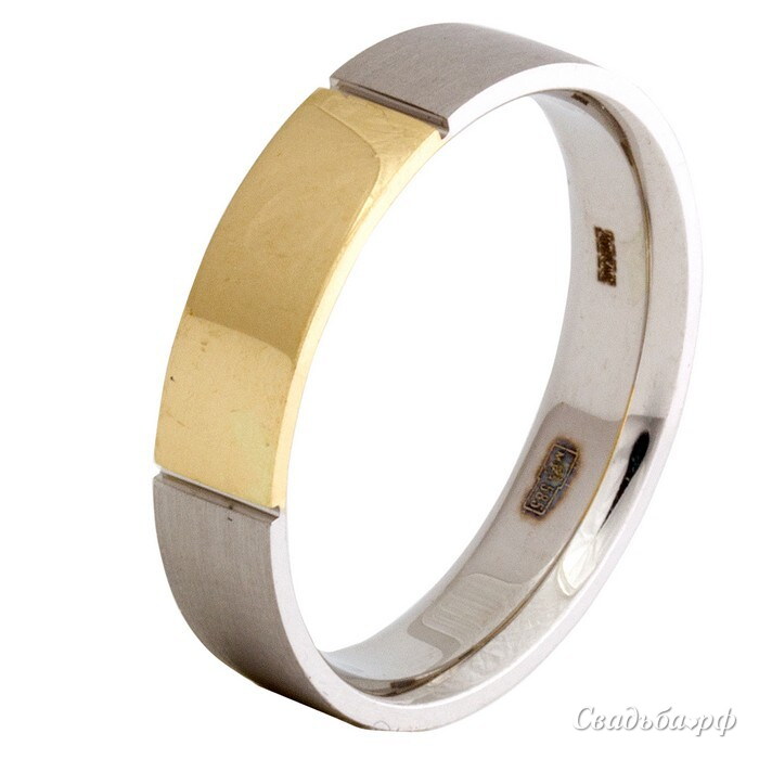 Оригинальное кольцо выполнено из нескольких видов драгоценного металла. Серебристый ободок дополнен золотистой вставкой, ограниченной тонкими выемками. Это обручальное колечко будет удобно сидеть на пальчике и сочетаться с другими украшениями. Такое изделие отечественного производства будет радовать вас своими безупречными формами долгие годы.