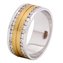 Массивное кольцо от лучших ювелиров России создано для самых притязательных молодожёнов. Это поистине королевское обручальное кольцо с широким ободком выполнено из нескольких видов драгоценного металла. Серебристая основа дополнена двумя рядами сверкающих бриллиантов и золотистой вставкой с продольным желобком посередине.