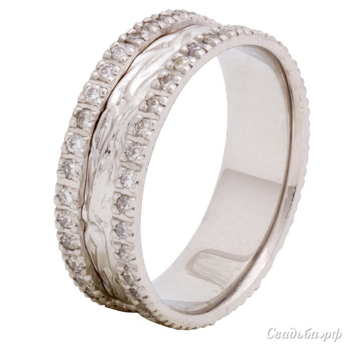 Эффектное колечко от ведущих ювелиров России выполнено из белого золота. Рельефная середина по бокам дополнена двумя рядами ослепительных бриллиантов безупречной огранки. Это обручальное кольцо отличается высочайшим качеством исполнения и оригинальным дизайном. С таким украшением вы всегда будете в центре внимания.