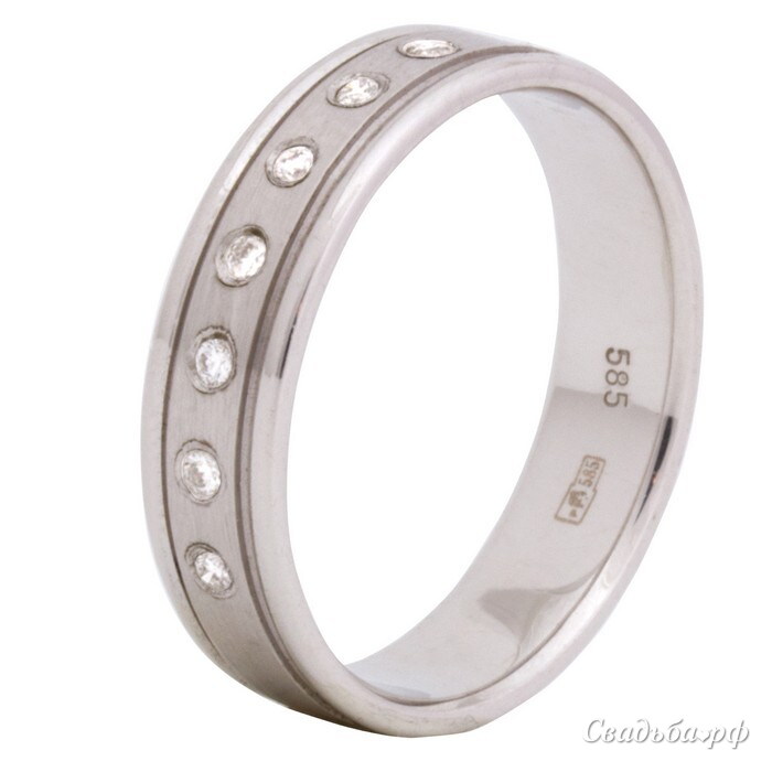 Роскошное кольцо выполнено лучшими отечественными ювелирами из благородного белого золота. Матовая середина ободка украшена ослепительными бриллиантами безупречной огранки. По бокам колечко дополнено сверкающими ободками, отделёнными бороздками. Представленное изделие станет эффектным дополнением вашего образа.