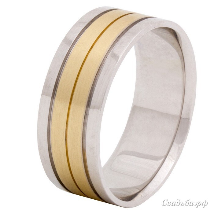 Оригинальное кольцо от лучших отечественных ювелиров не оставит равнодушными даже самых требовательных молодожёнов. Это обручальное кольцо выполнено из нескольких драгоценных металлов. Две золотистых ободка в середине гармонично сочетаются с серебристыми полосами по бокам. Эти части отделены друг от друга продольными выемками.