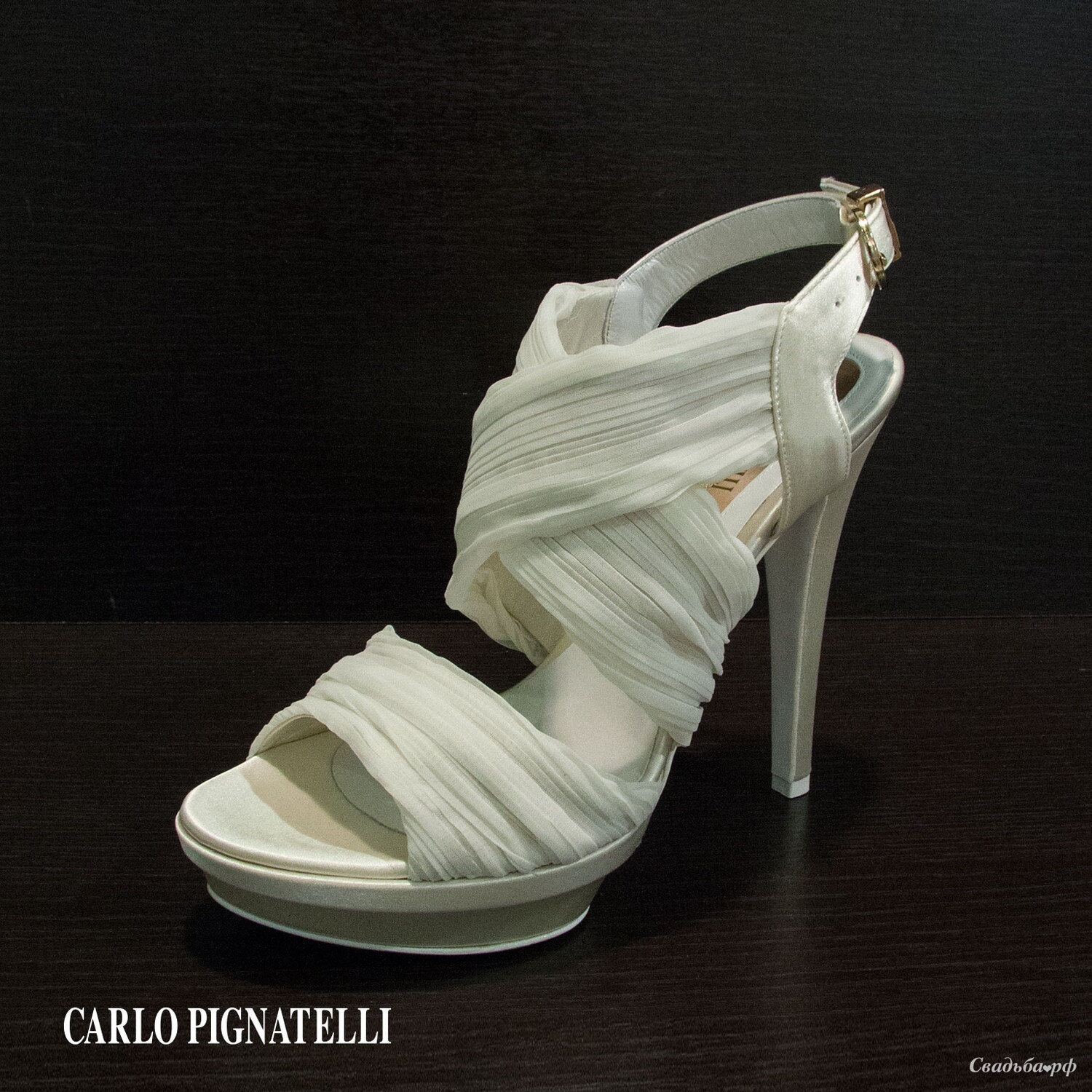 Очень интересные и необычные туфли от самого известного итальянского свадебного дизайнера Carlo Pignatelli. Сочетание двух фактур - ткани и кожи - основная изюминка этих босоножек. Высокий каблук, небольшая платформа, открытая пятка и мысок, элегантная застежка на кожаном ремешке, мелкая складка на тканевых элементах - все это не оставит равнодушной даже саму капризную невесту.