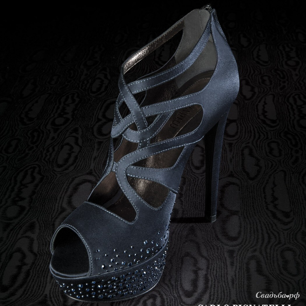 Тёмно-синие свадебные босоножки могут похвастаться высокими каблуками и безупречным дизайном. Кокетливо открытый носочек и затейливое переплетение полос подчеркнут красоту Ваших ножек. Платформа и низ передней части украшены стразами. Такая стильная обувь добавит Вам несколько сантиметров роста. При этом босоножки устойчивы и комфортны.