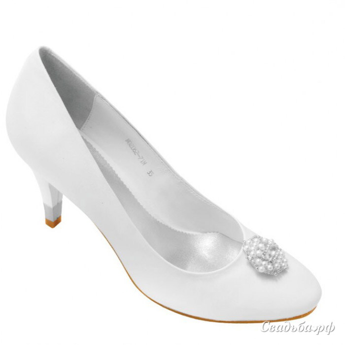 Элегантные туфли-лодочки, выполненные из белоснежной кожи, отличаются высоким качеством, безупречным стилем и классическими формами. Закрытый мысок каждой туфельки декорирован круглой вставкой из жемчуга и бусин. Небольшой и очень устойчивый каблучок придаёт модели особый шарм. Такие туфли придутся по душе самым женственным и романтичным невестам.