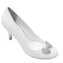 Очаровательные туфли-лодочки, выполненные из белоснежной кожи, отличаются высоким качеством, безупречным стилем и классическими формами. Закрытый мысок каждой туфельки декорирован бантом из ослепительных страз. Небольшой и очень устойчивый каблучок придаёт модели особый шарм. Такие туфли придутся по душе самым женственным и романтичным невестам.
