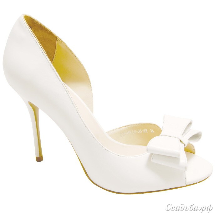 Восхитительные туфельки из белоснежной кожи просто созданы для Ваших стройных ножек. Головокружительная шпилька, не смотря на свою высоту, порадует Вас устойчивостью и надёжностью. Открытый мысок декорирован кокетливым бантиком. Оригинальная выемка с внутреннего бока каждой туфельки придаёт модели особый шарм.