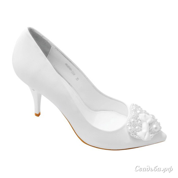 Очаровательные туфли-лодочки, выполненные из белоснежной кожи, придутся по душе самым романтичным невестам. Эта удобная модель с небольшим каблучком подчеркнёт стройность Ваших ножек. Но настоящая изюминка представленной модели – это эффектные вставки из крупных жемчужин и бусин, расположившиеся на закрытых мысках туфелек.