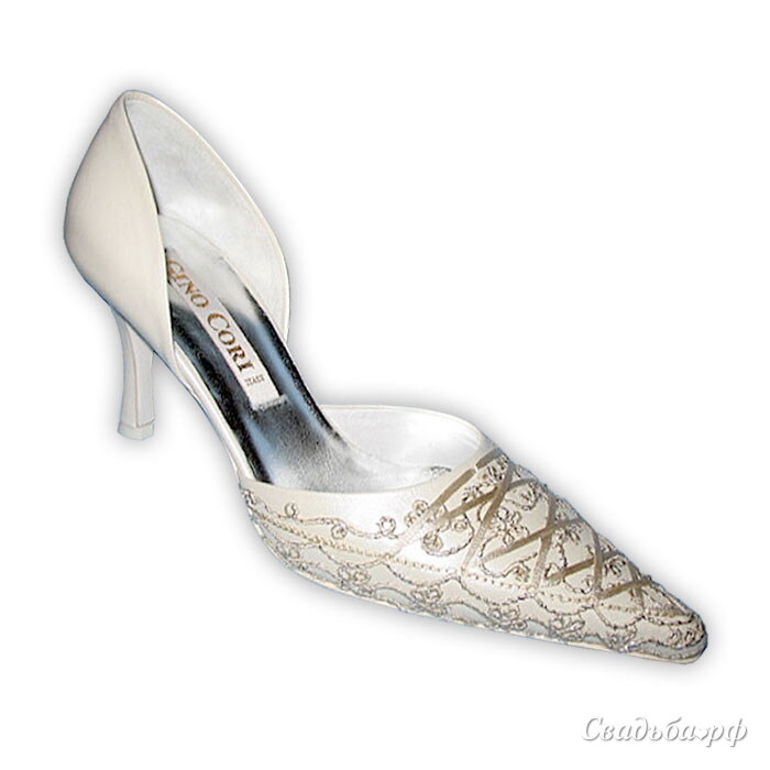 Известная итальянская фирма Gino Cori предлагает роскошные свадебные туфли из кожи кремового цвета. Туфли на невысоком устойчивом каблуке, с закрытой пяткой, удлиненным носком. Декорирована эта обувь великолепной шелковой вышивкой золотистого цвета и тонкой шелковой лентой в цвет. Туфли достойны королевы!