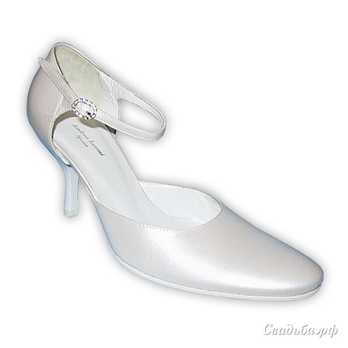 Элегантные свадебные туфли белого цвета выполнены из высококачественной итальянской кожи. Пятка закрыта, аккуратный тоненький ремешок украшен пряжкой-застежкой со стразами. Невысокий каблук достаточно устойчив, что важно при длительной носке. Особый шик этим туфлям придает перламутровый блеск кожи.
