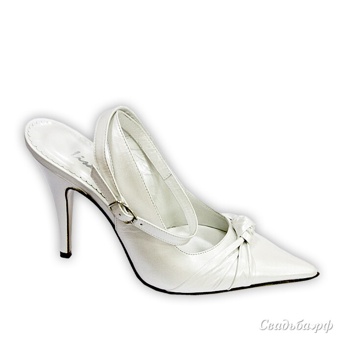 Открытые свадебные туфли от итальянского бренда Lisa Donetti. Заостренный длинный носок, открытая пятка, ремешок с застежкой обвивает ногу в районе щиколотки. Носок декорирован узелком из двух тонких кожаных полосок. Не смотря на то, что каблук высокий, колодка очень удобная и в такой обуви будет удобно весь день. Туфли предлагаются в белом цвете.