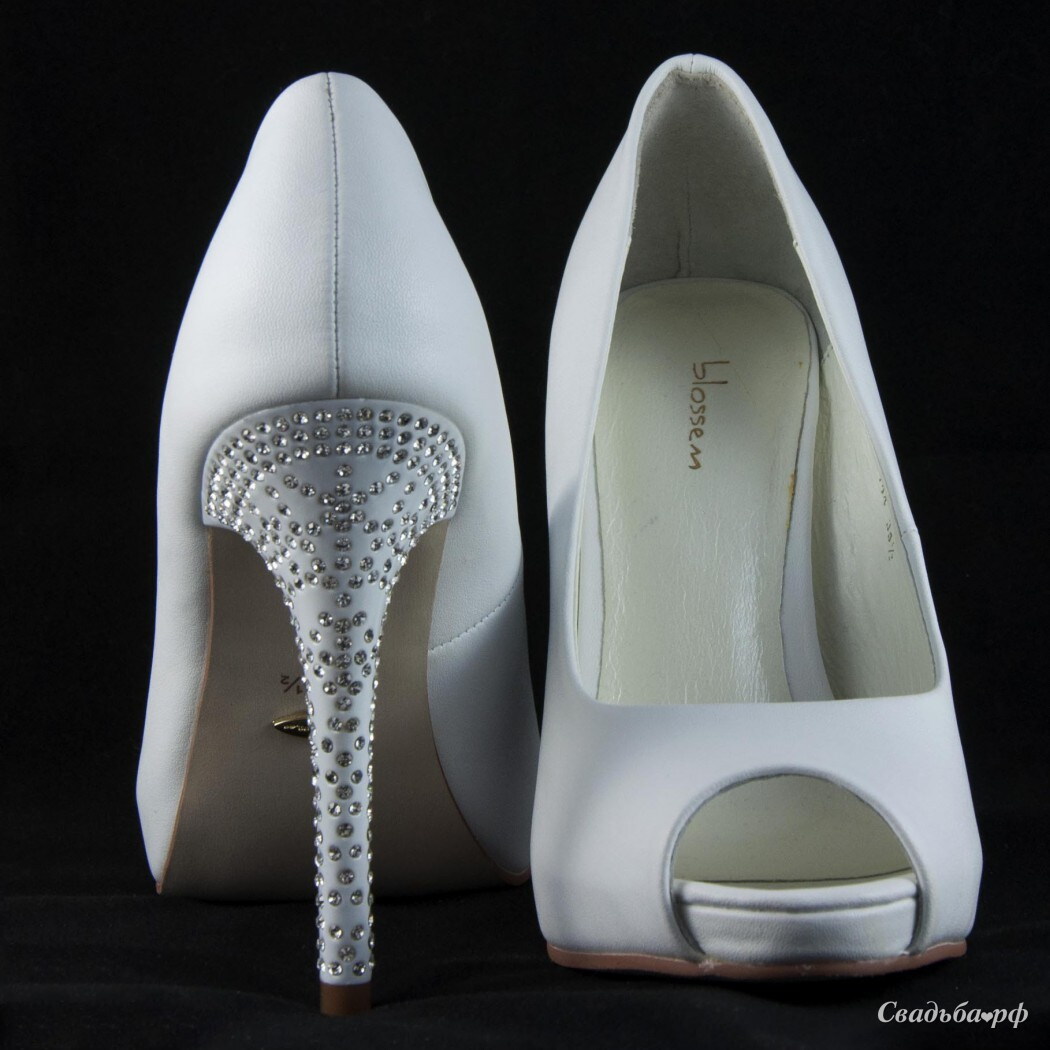 Изящные свадебные туфли с кокетливым вырезом на носочках выполнены из кожи и ткани. Представленная обувь дополнена высокими каблуками, буквально усыпанными стразами. Эти устойчивые туфли идеально садятся по ножке, не натирают и не сдавливают ступню. Ваши ножки в такой обуви будут казаться ещё стройнее.