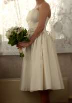 Изящное платье в стиле 50-х, цвета айвори. Юбка чуть ниже колен. Подойдет миниатюрным девушкам 150-155 см. Корсет на шнуровке. В корсет вшиты чашечки с эффектом push-up. В отличном состоянии, только после химчистки.