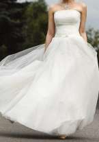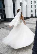 Платье было куплено 3 недели назад и в нем была сыграна одна великолепная свадьба. Размер платья 42-46. Сзади оформлено шнуровкой. Мне идеально село на рост 170 см + каблуки. В комплект к платью прилагается фата расшитая бисером и стеклярусом и набор украшений + набор бижутерии