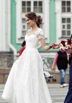 Свадебное платье для утонченных натур: - цвет айвори; - силуэт А; - кружевная верхняя юбка; - спинка оформлена аккуратным вырезом, позволяющим надеть бюстгальтер (лямки и застёжка не попадают под вырез и ничего не торчит); - корсет на шнуровке. Платье после химчистки. Мой рост 168 см, вес 53 кг, туфли 9 см каблук. В подарок прилагаю фату (надевалась на 2 часа). Платье лёгкое, приятное к телу, за счёт красивого кружева и дизайна верха создаётся нежный образ, смотрится стильно. Больше фото в личку.