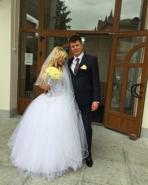Очень красивое свадебное платье размер 44-46, но мы одевали на 42.(корсет). На корсете украшение маленькими жемчужинами! Удачная посадка, не создает никаких складок на талии! Смотрится очень роскошно) перчатки к платью в подарок!