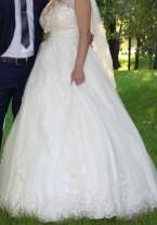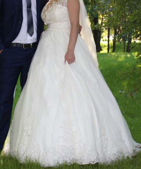 Свадебное платье: размер 42-46, пышное со шлейфом, корсет на молнии со шнуровкой под любой размер груди, с кружевами, 5 юбок. Есть кольца под юбку,чтобы платье выглядело пышнее. Одевалось один раз, состояние очень хорошее после химчистки, ни один бисер не выпал. В комплекте фата и чехол, туфли в подарок, звоните, приходите, примеряйте, забирайте).